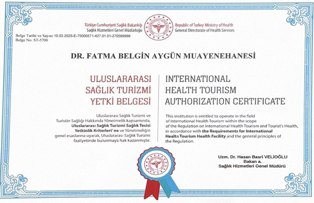 Tesisimiz, Uluslararası Sağlık Turizmi ve Turistin Sağlığı Hakkında Yönetmelik kapsamında, Uluslararası Sağlık Turizmi Sağlık Tesisi Yetkinlik Kriterleri’ne ve Yönetmeliğin genel esaslarına uyarak, Uluslararası Sağlık Turizmi faaliyetinde bulunmaya hak kazanmıştır.